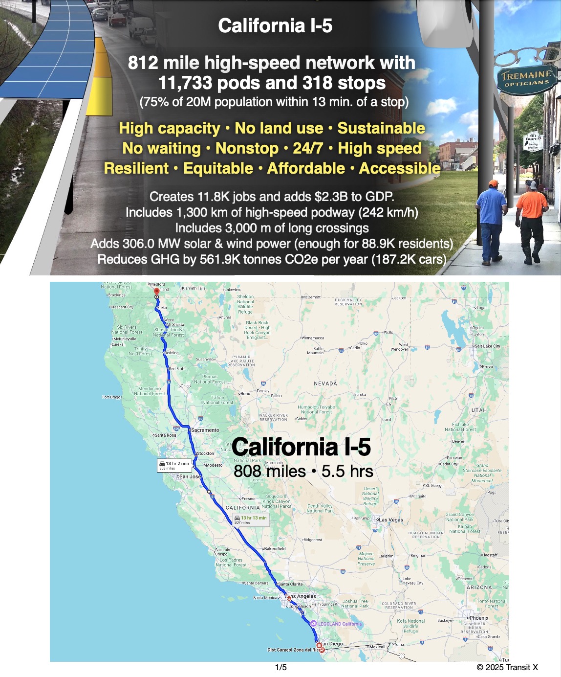 Pods operate similar to on-demand, autonomous taxis, but travel on a new light infrastructure — a podway — that takes no land. Unlike conventional public transit, podways are 100% privately funded and provide non-stop trips that include first-and-last mile for both people and freight.